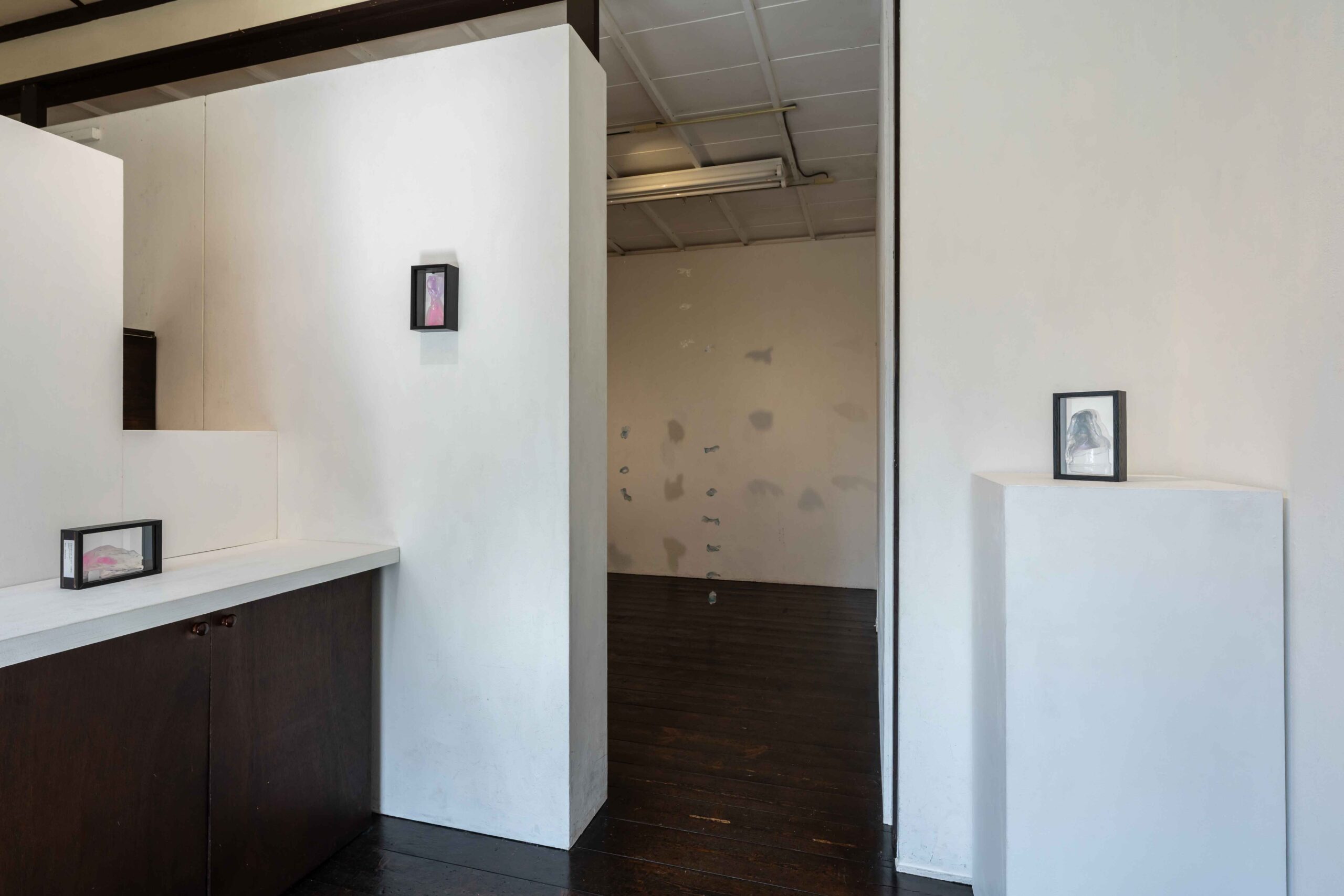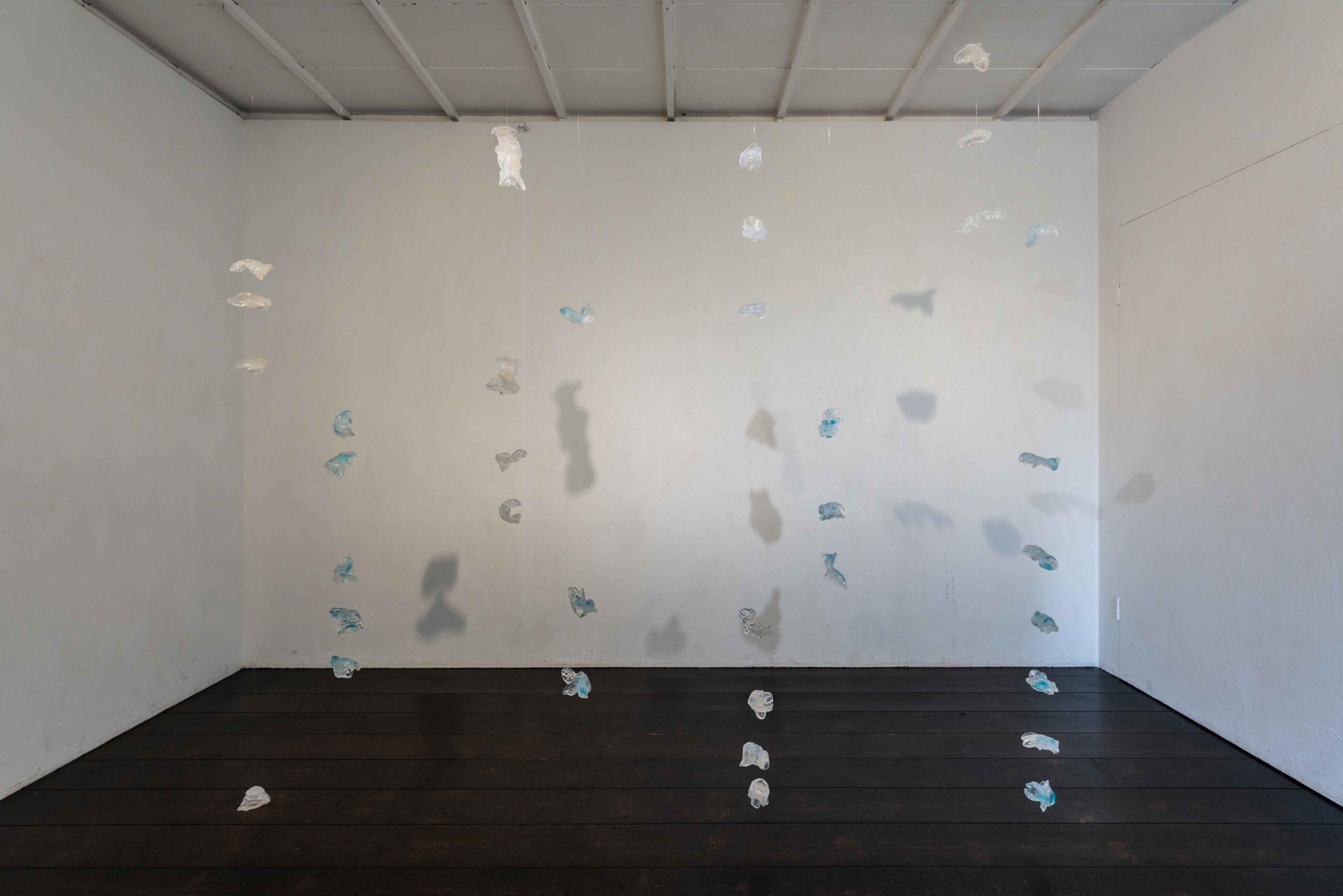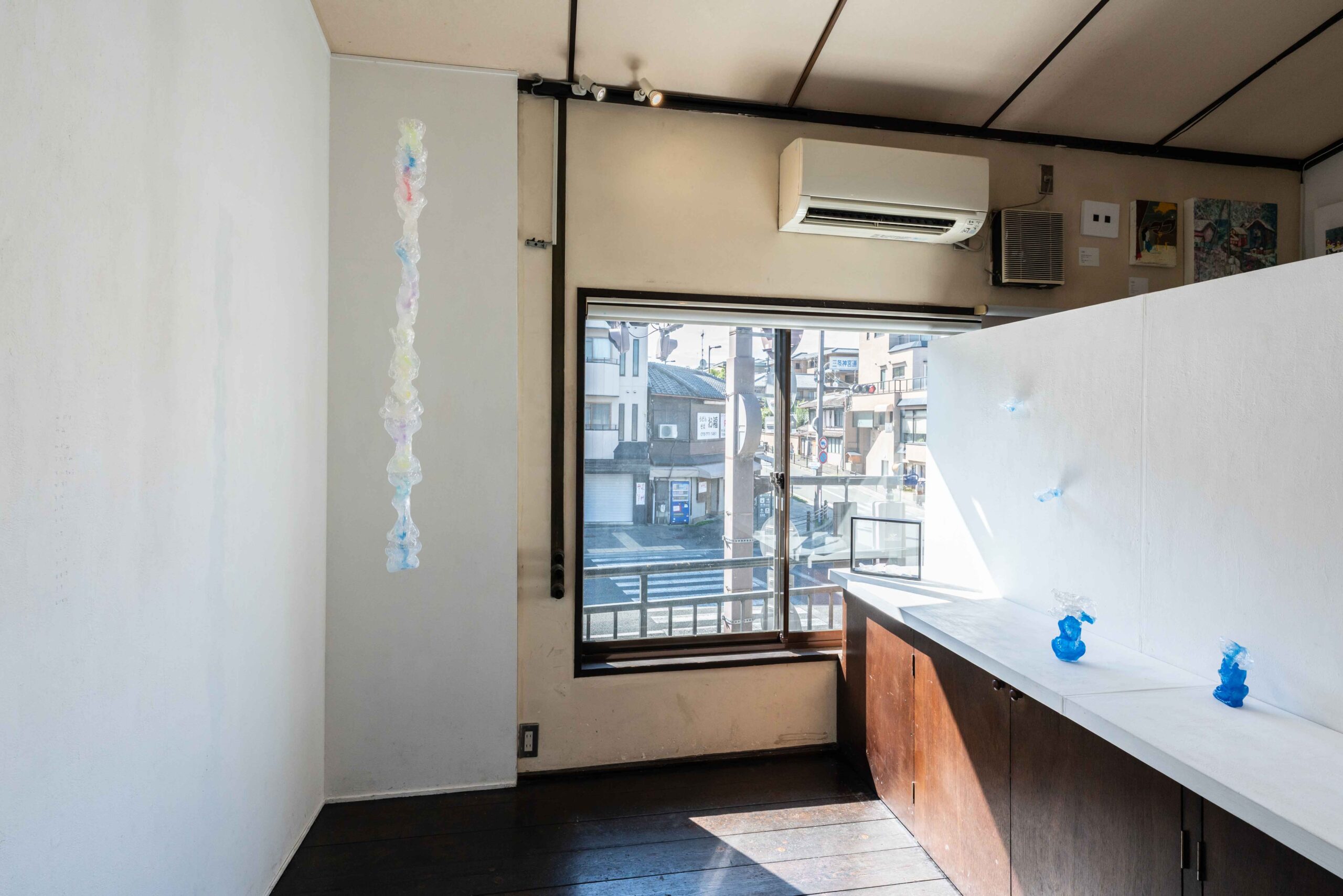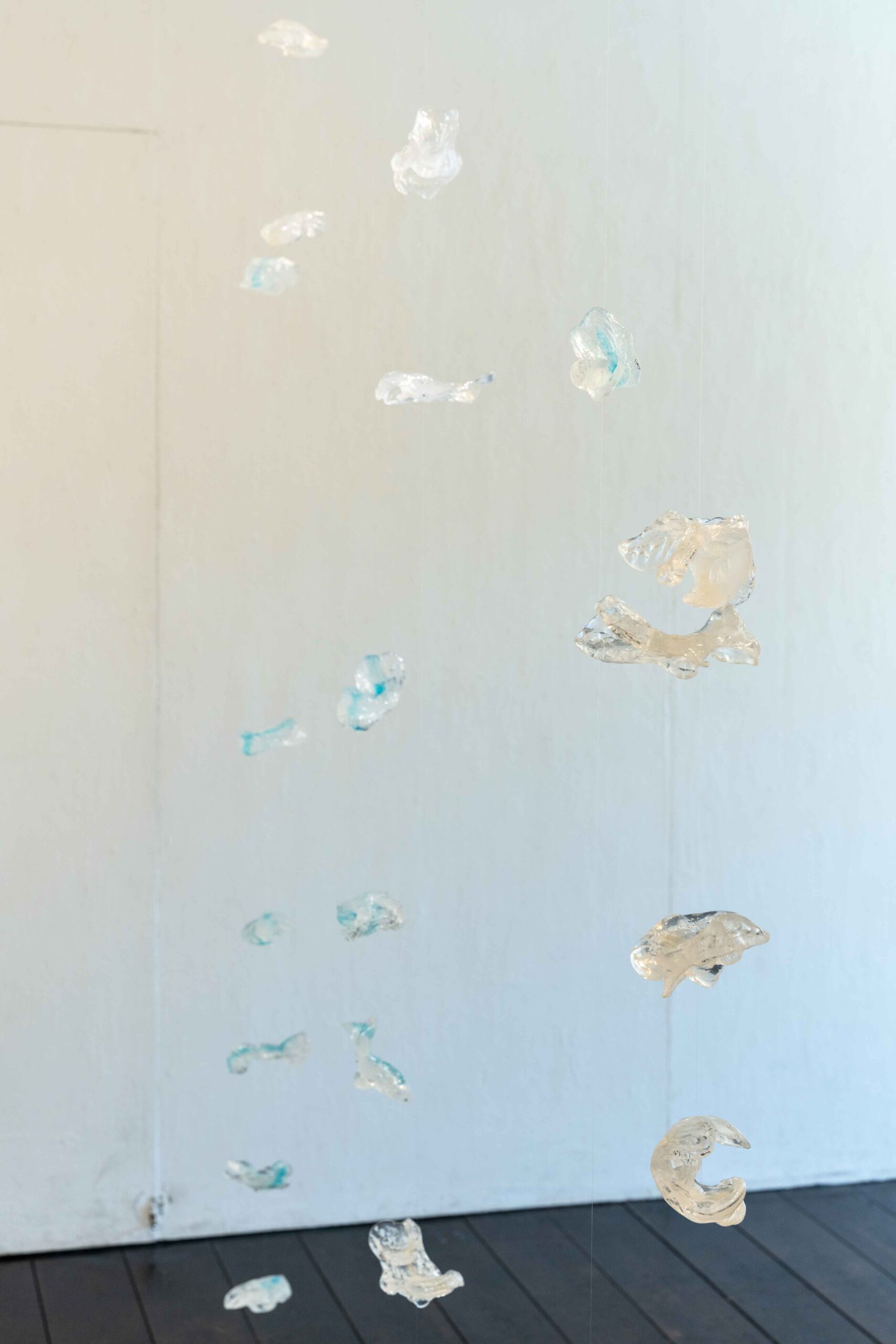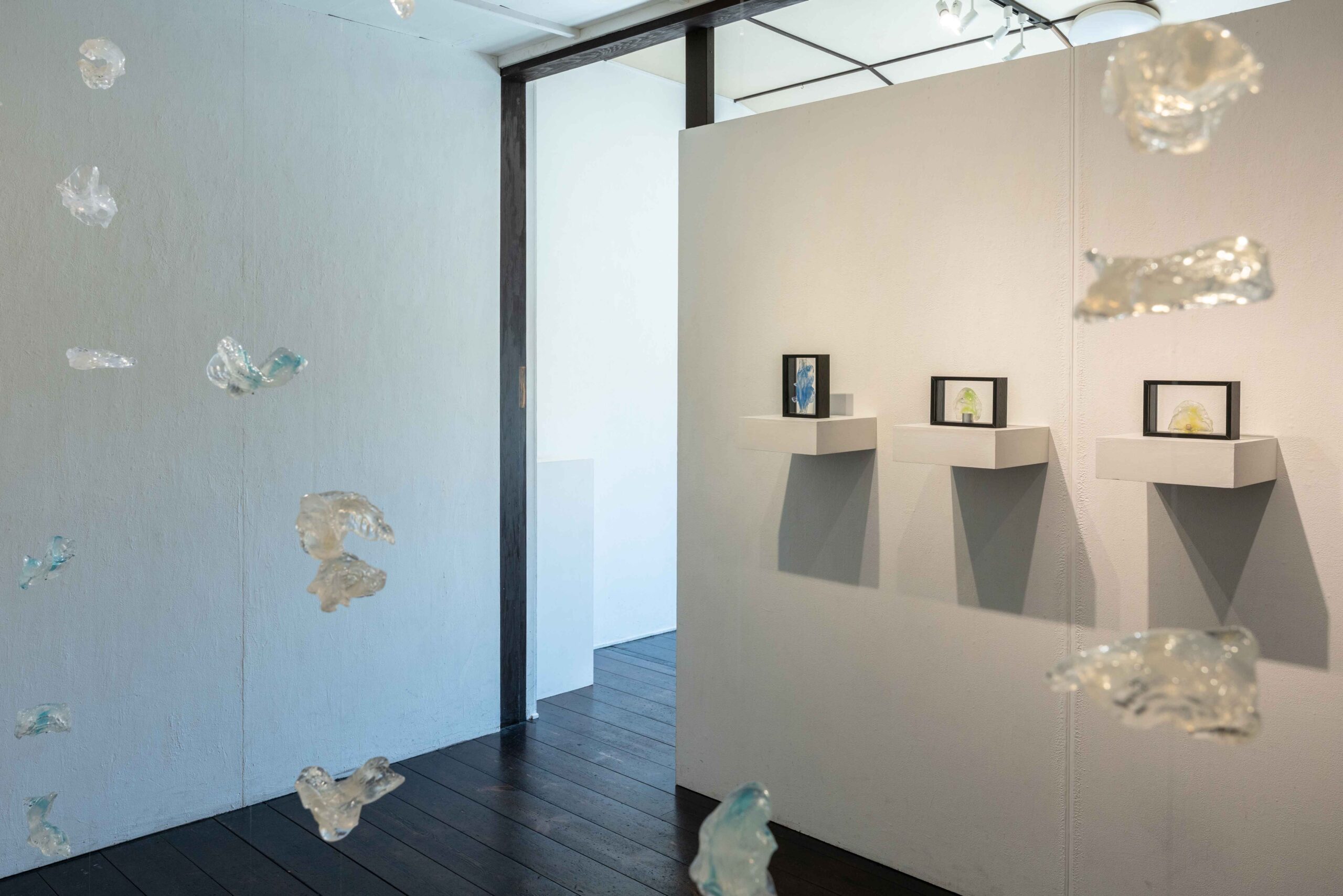 会場に展示されている立体作品は、温めると柔らかくなり冷やすと固まるポリエチレン樹脂を 使用しています。この樹脂を自身の口の中に入れ、一音節や単語などの言葉を発音し、口中の型を取り、 吐き出したものを言葉の彫刻としています。 樹脂と木材やアルミなどの異素材を組み合わせることで言いよどみや言葉に詰まる様子を表現する 《Phonation Piece -Distortion-》シリーズ、あくまでも家族の何気ない会話ですが、仏師である父と 摩利支天尊と呼ばれる仏像について対話している様子を録音し、発話内容を1 人で言い直し、 テグスで吊る事により会話の時間軸、間を同時に再現する《Phonation Piece -DIALOGUE-》、 しゃがみ、あおぎみ、とぶ、という体の動作と制作時の造形や形態、空間での展示方法をリンクさせた 《Phonation Piece -SHAGAMI AOGIMI TOBU-(Distortion)》、樹脂の両サイドから向かい合うように 発声し型取りを行った《Phonation Piece -FURERU-》、言葉遊びのしりとりは最後と最初が同じであり、 造形として接続が容易で、単語を積み上げやすいことから着想した《Phonation Piece -SIRITORI-》を 展示しています。