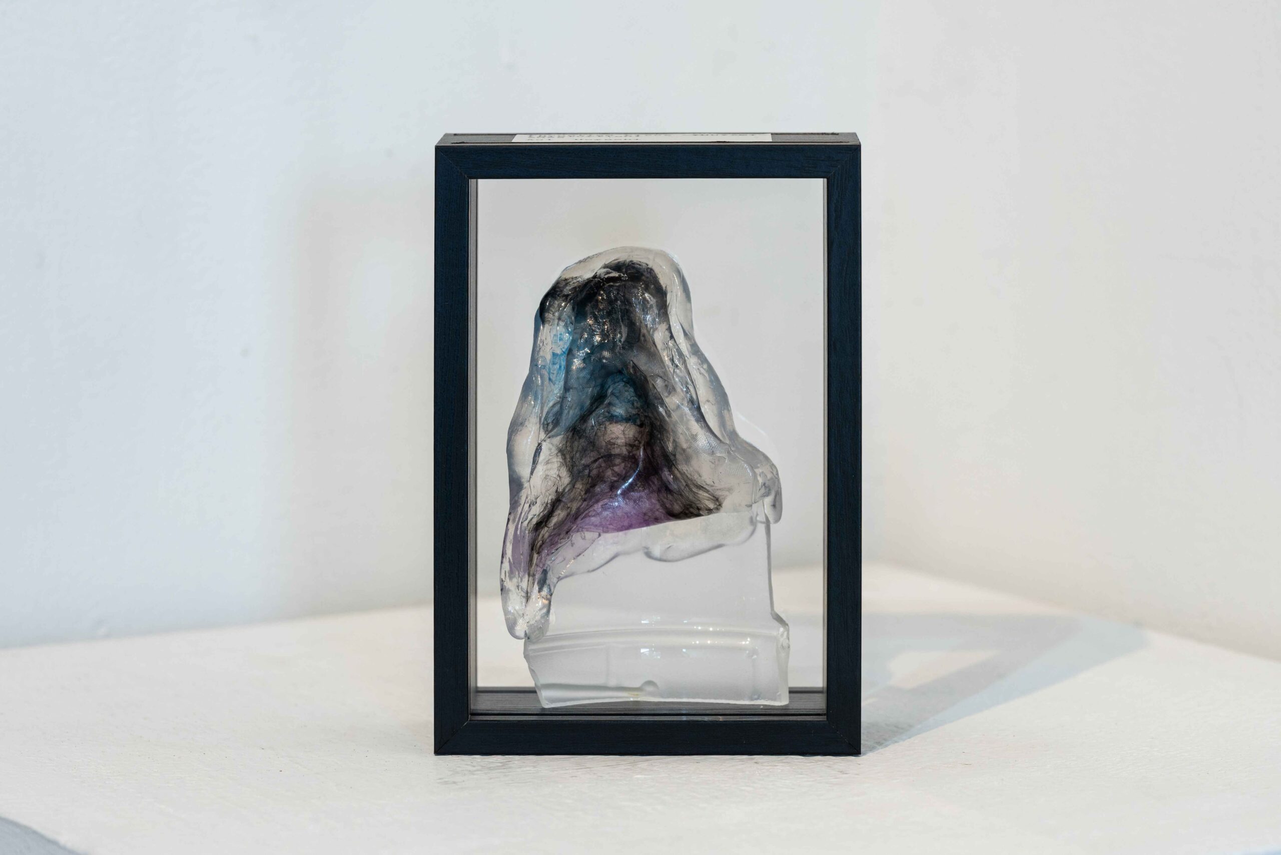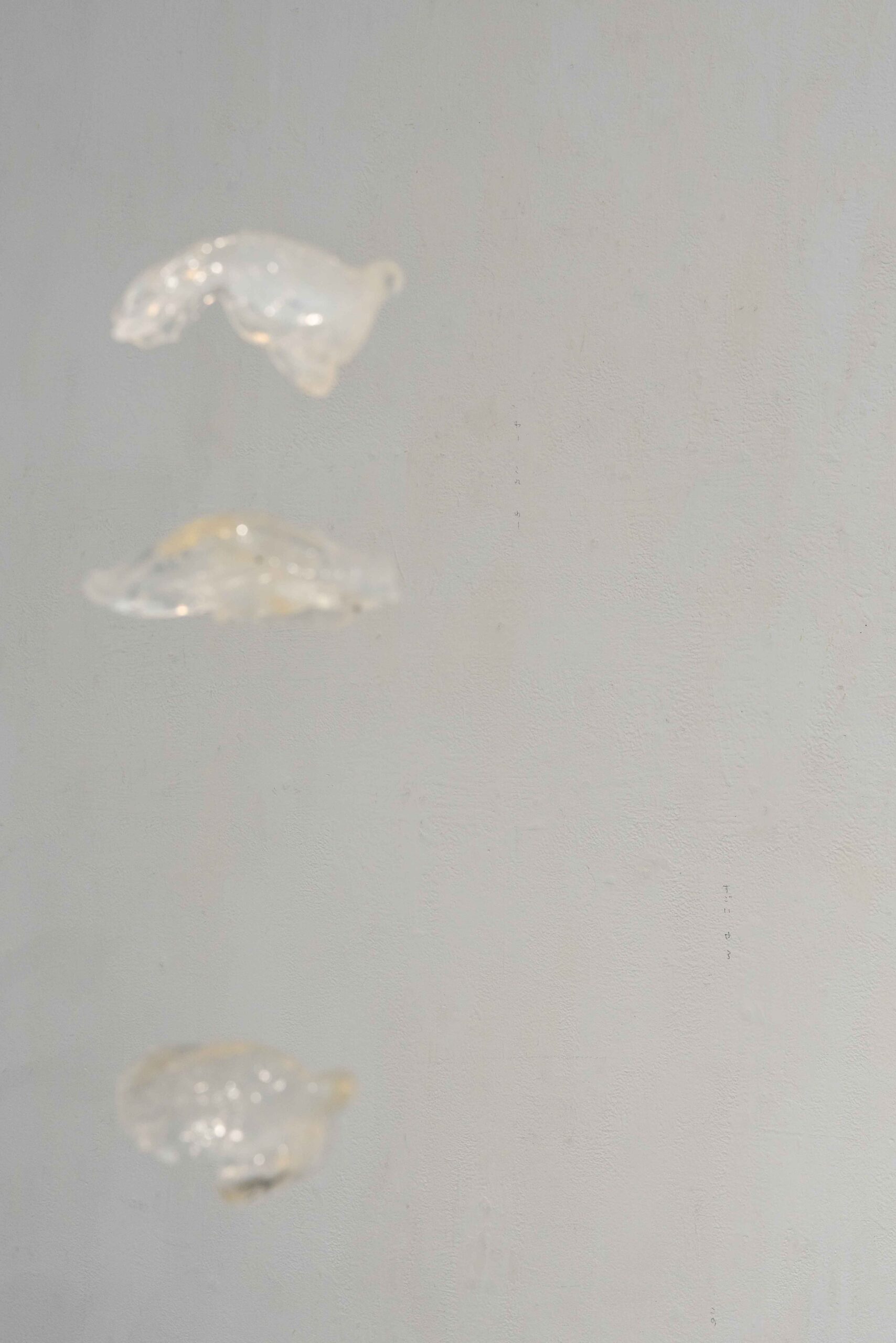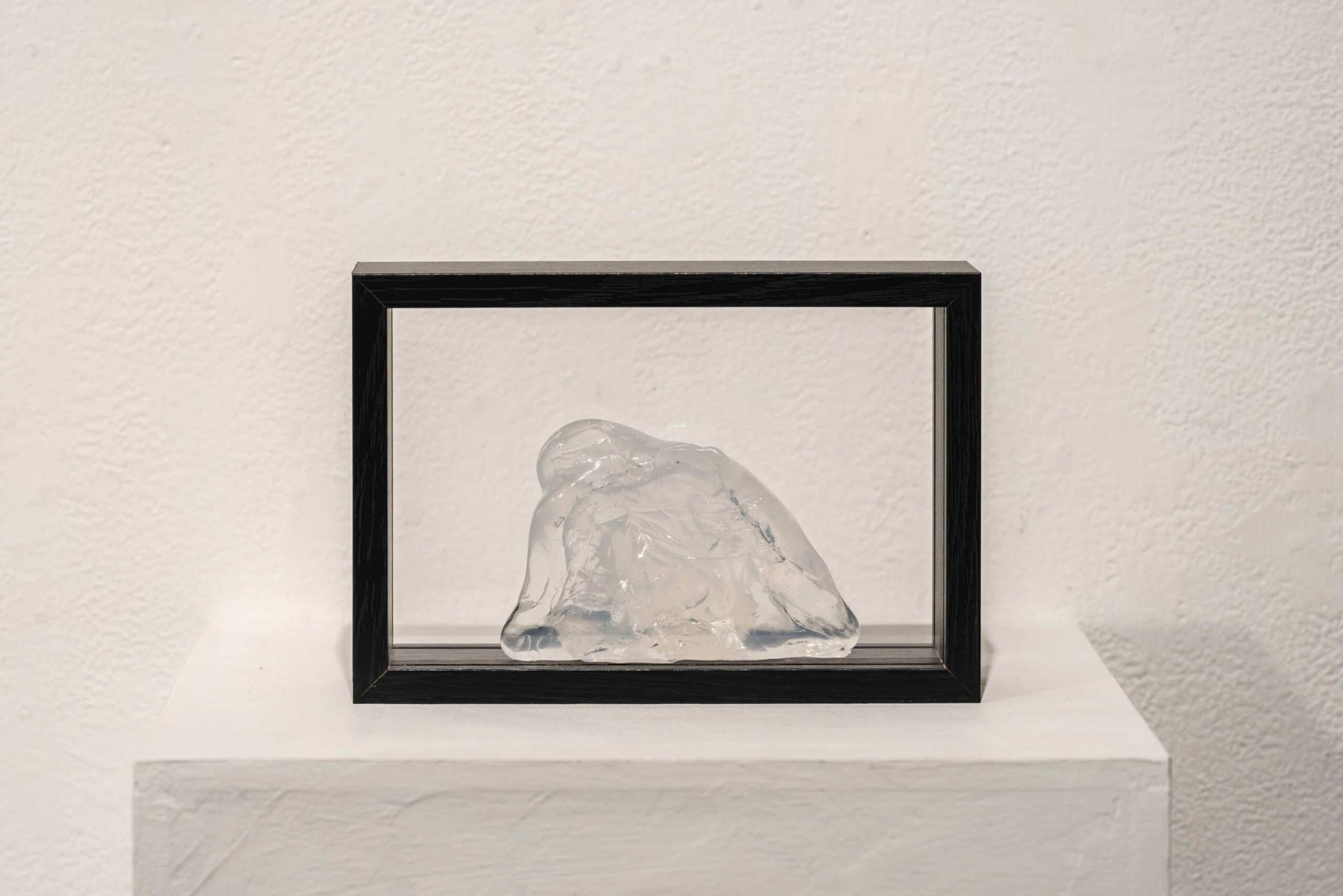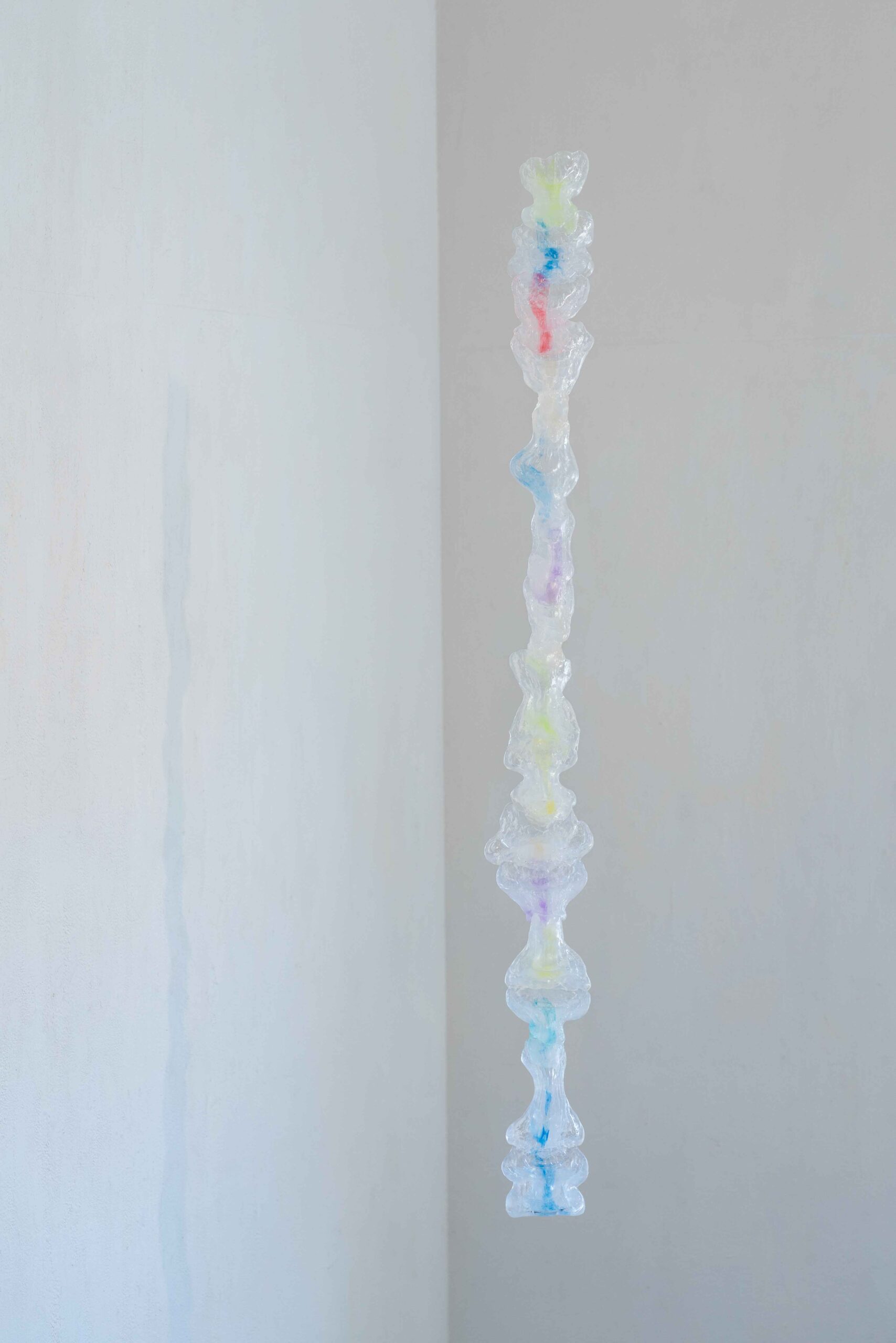 本展では、口内で硬化させたポリエチレン樹脂製オブジェに「時間」を与える試みです。