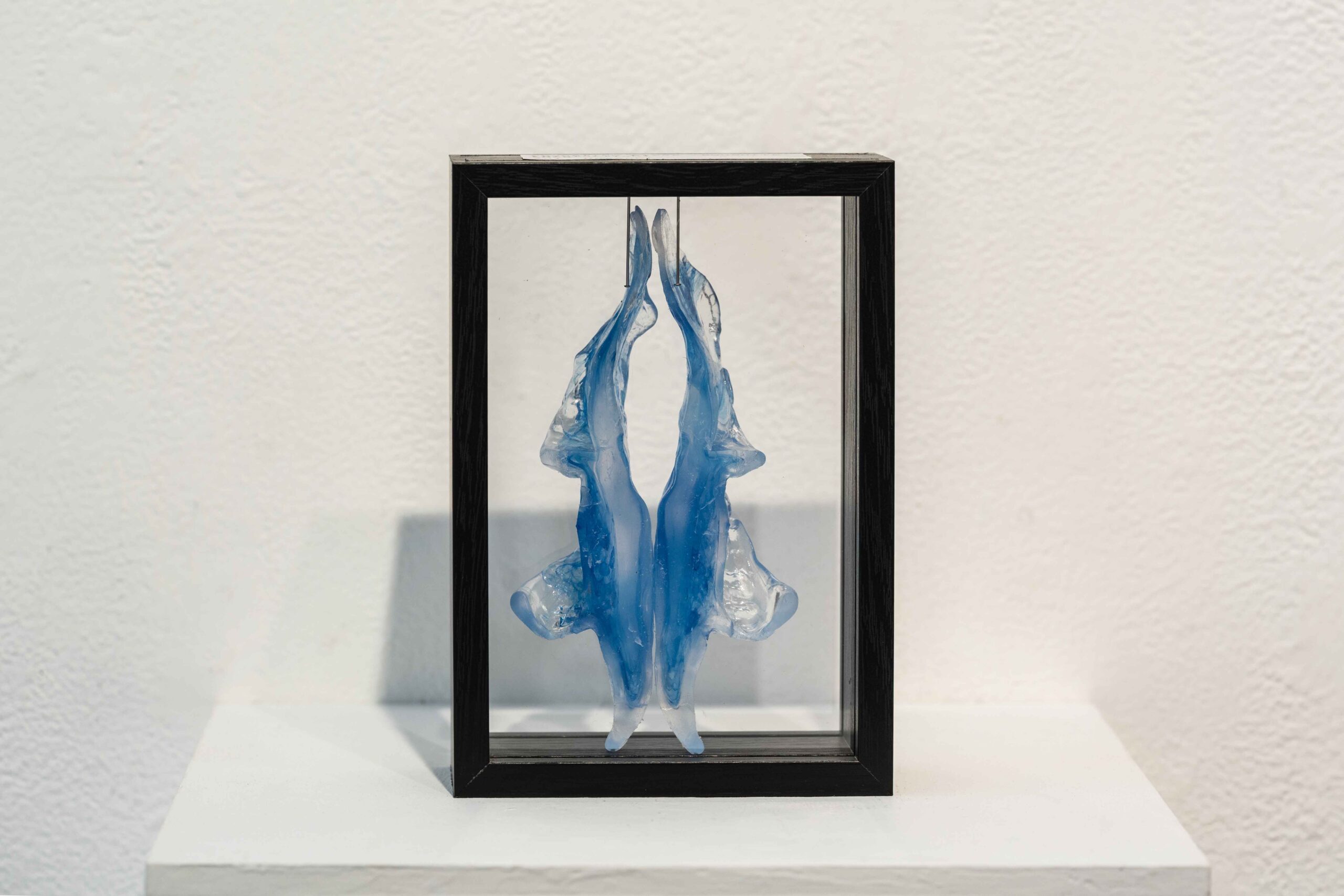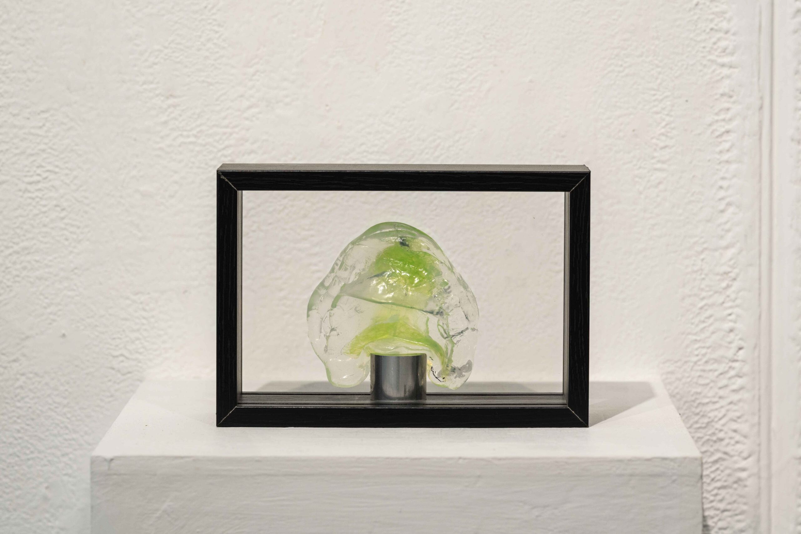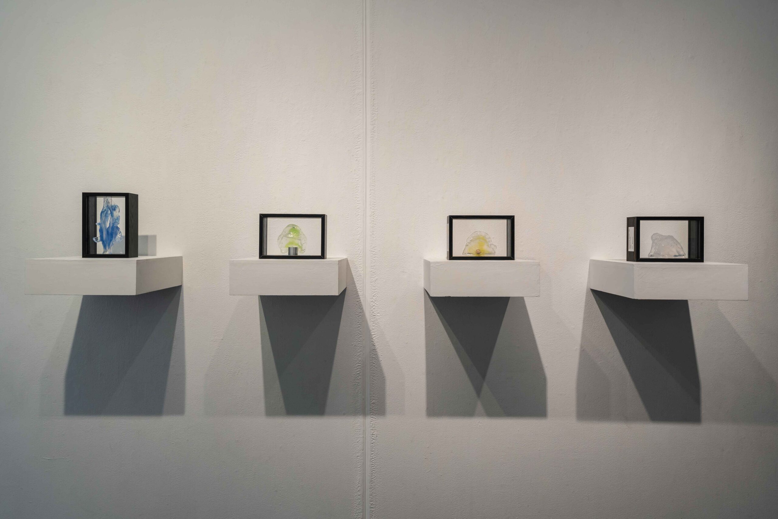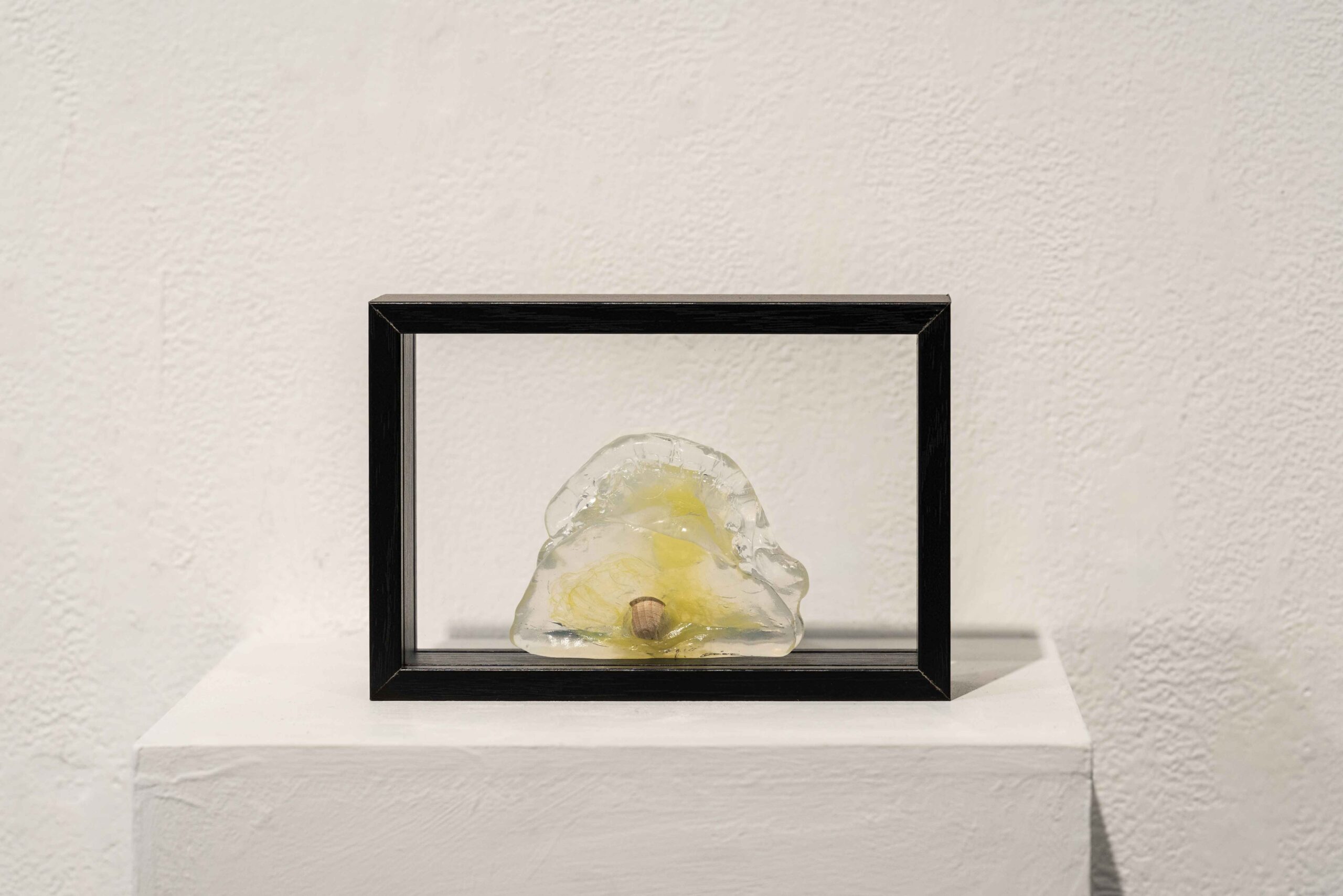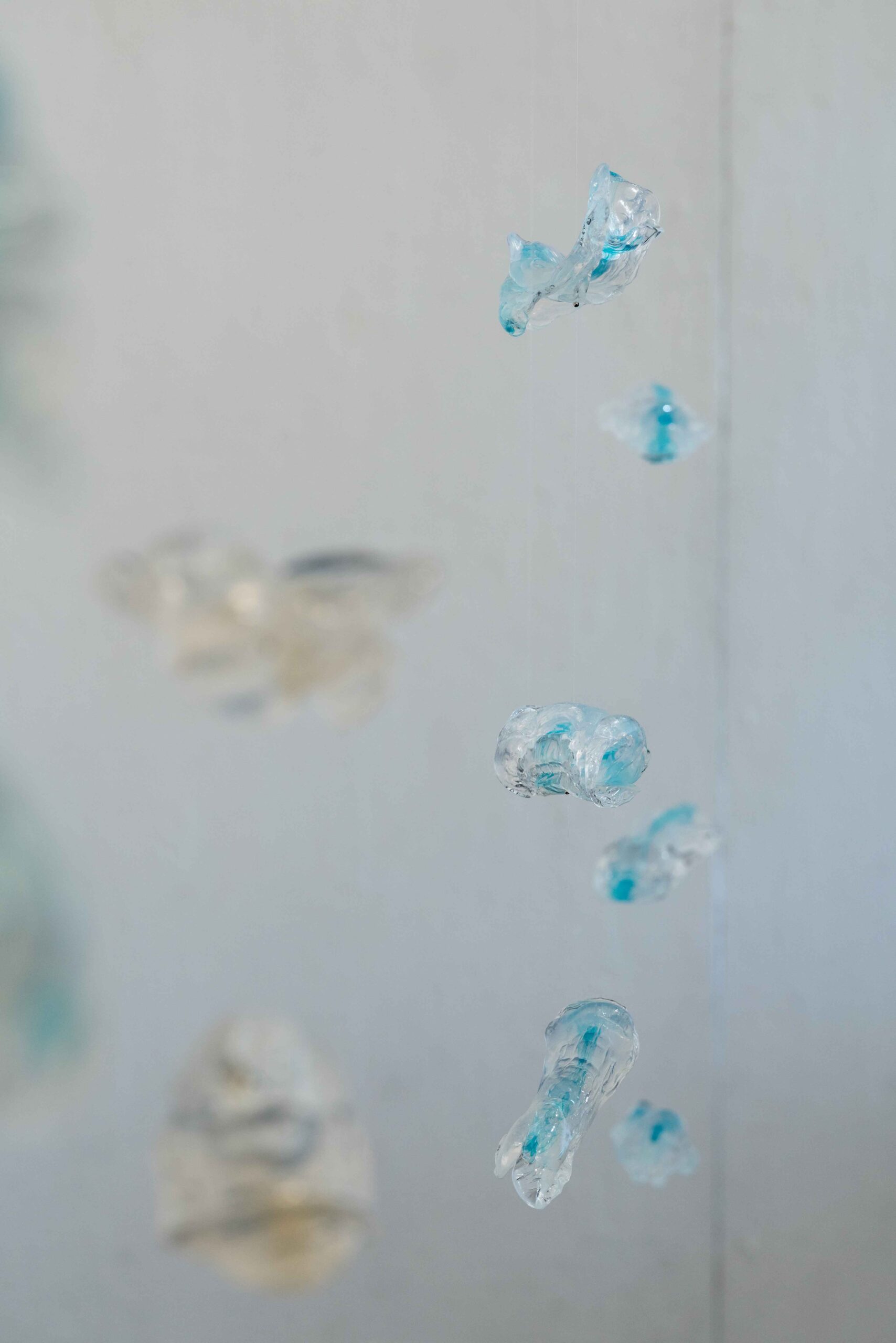 本展では、口内で硬化させたポリエチレン樹脂製オブジェに「時間」を与える試みです。