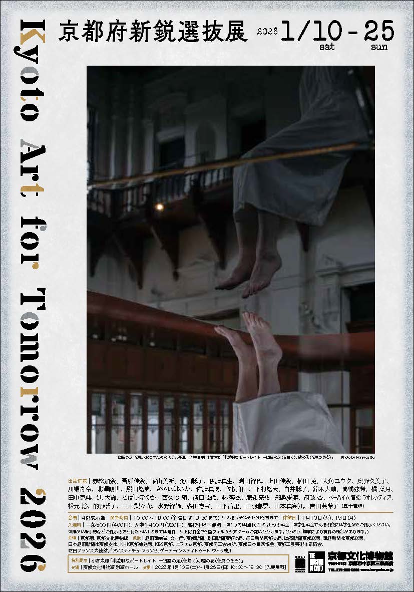 本展は、京都を中心に活動する新進の若手作家を紹介し、次世代を担う作家として京都から世界へ発信していくことを目的に開催します。美術系大学、画廊、美術館学芸員等からの推薦を受けた若手作家の中から、選考委員により選抜された作家40名の作品を展示いたします。京都ゆかりの新進作家たちとともに、前年度選抜展の最優秀賞受賞者である小宮太郎氏をお招きし、別館ホールにて特別展示を行います。「みえる/みえないこと・もの」のあり方を問い続ける小宮氏の制作を通して、会場の「別館ホール」が、移り行く時間と人の営みを包含した多層的な空間として立ち現れてくることでしょう。